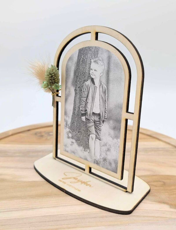 Boog fotohouder met foto en gravering per 5 stuks, verschillende teksten mogelijk via opmerkingen.