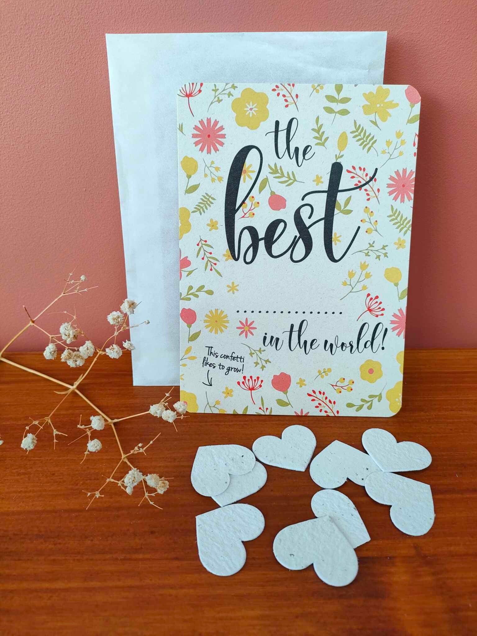 Deze wenskaart is gemaakt van bloeipapier, dit is duurzaam papier van gerecyclede oude kranten of katoen resten waar bloemen, groente of kruiden-zaadjes in verwerkt zijn. Wanneer de kaart in de aarde wordt gelegd groeien er fleurige bloemen, kruiden of lekkere groentes uit.