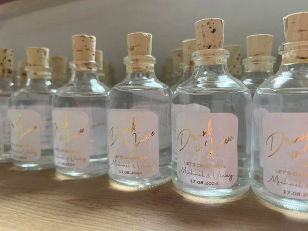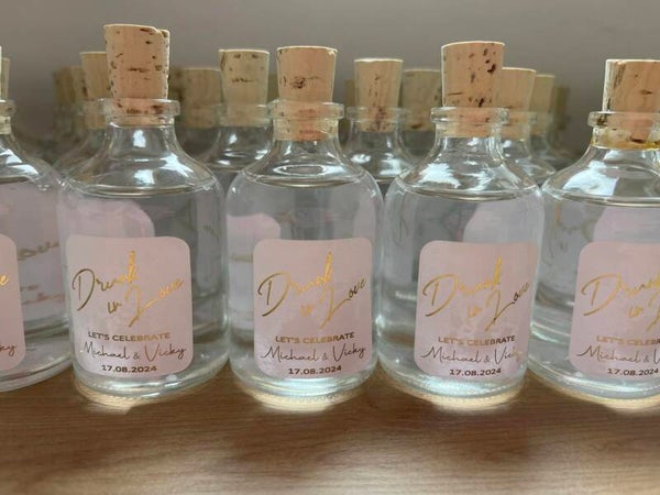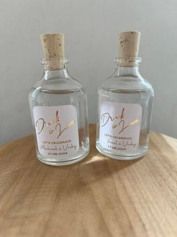 Gin flesje met kurkdeksel en etiket met opschrift in goudfolie