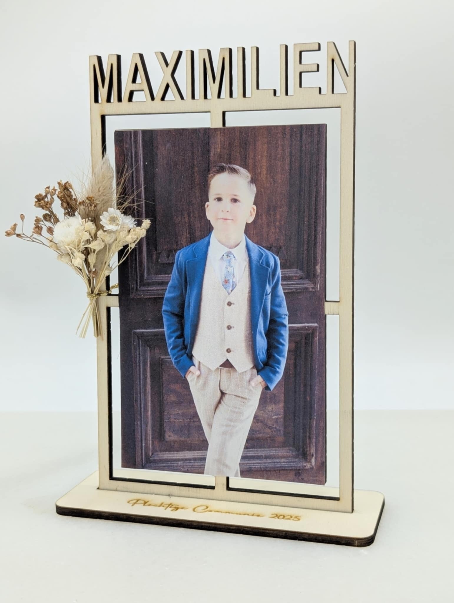 Boog fotohouder met foto en gravering per 5 stuks, verschillende teksten mogelijk via opmerkingen.